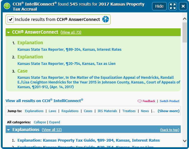 - Include or remove results from CCH AnswerConnect (available in the CCH IntelliConnect results).