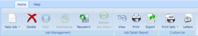 The main components of the Job Status window, the Application menu, ribbon, Quick Access Toolbar, and grid, contain commands or allow access to the commands used to perform and manage batch processing.