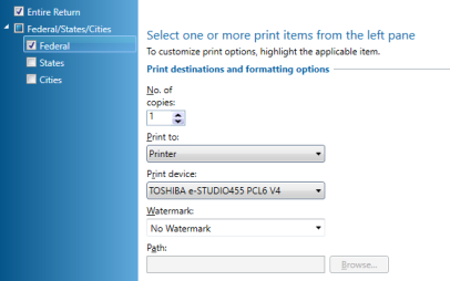 4. If you are printing a large return and want to calculate the return before printing, select the Calculate return before printing check box. Be aware that calculation can add significant time to the printing process.