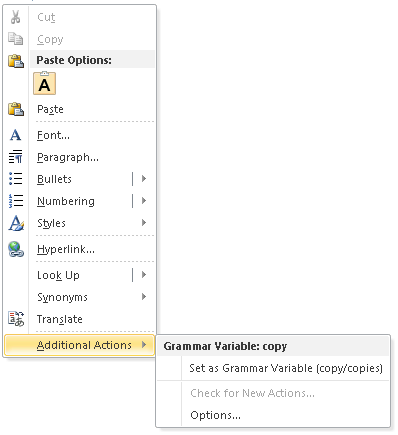 Each grammar variable has an alternate grammar option and each pair of options displays as one item in a menu in the Word pane. When you  right-click a potential grammar variable, the menu displays options to set grammar variables. If a grammar variable has more than one pair of options associated with it, all choices display in the  menu.