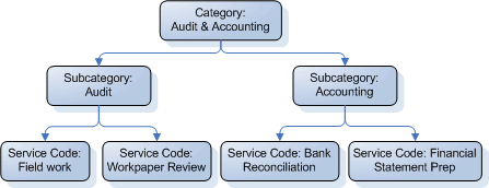 If your firm has many service codes, you may want to create categories and subcategories to group similar codes together. While service codes are required, categories and subcategories are not.